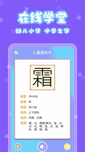 APP里还有汉字发音点读和笔画笔顺练习,孩子可以边听边写,挺有帮助的。特别是“在线学堂”,涵盖了小学一年级的内容,提前学或者复习都很方便。每天只需要10分钟课程,孩子就能高效识字,这点真的很实用。