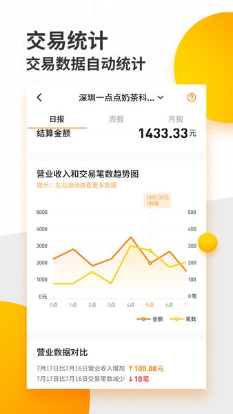 为商家提供交易统计等功能帮您了解经营状况,获得更多营业收入,为商家提供全场景、更专业的移动服务解决方案,能够查询到门店的每一笔账单,让您所有的账单都有迹可循,不会出糊涂账。