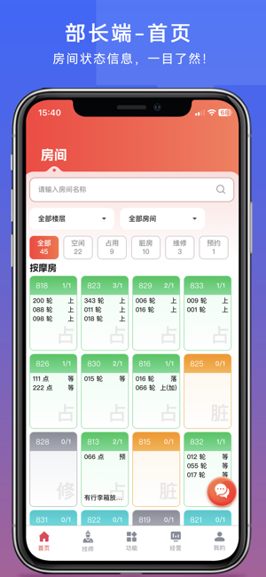3、房间状态信息在系统中实时更新,无论是空闲、占用还是清洁中,都一目了然,便于前台和技师快速掌握,提升服务效率。