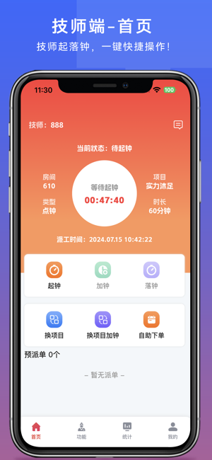 技师在手机APP起钟、加钟、落钟、下单等,预约、查询钟数及提成;