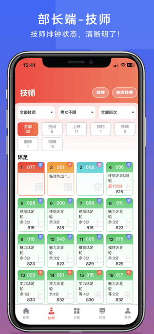 4、技师的排钟状态清晰明了,系统根据技师的空闲时间、技能等级等因素自动排钟,确保每位技师都能得到公平合理的安排。