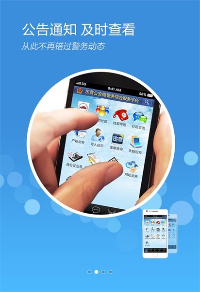 为提升公安机关为民服务水平,东营公安分局以便民、利民为宗旨开发了手机版的便民服务平台东营公安微警务综合服务平台。该平台将警务工作内容以明快直观的界面布局在手机上,使通讯设备与业务处理设备合二为一。东营公安微警务综合服务平台集咨询、办事、举报、投诉、监督、考核、服务等功能于一体,包括快速查询通道、服务群众、打击犯罪、警方信息、警民互动、后台实现六大部分。