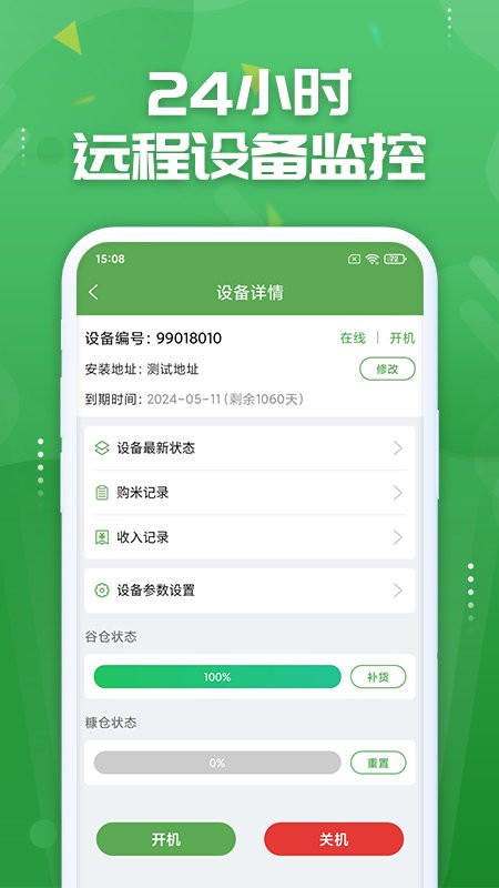 1.实时查看设备状态、远程补货、设置售米价格,接收设备故障警报,操作简单更省心。