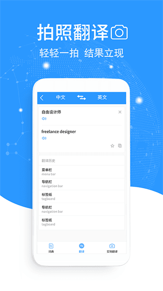 拍照翻译:一键拍照,立现实景译文,流利英语天天说。