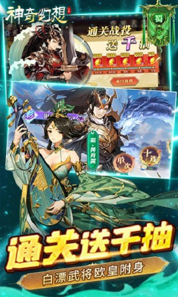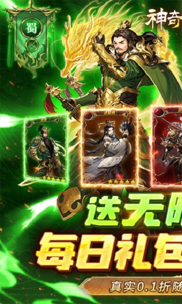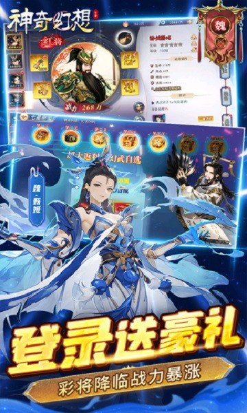 《神奇幻想》百种武将搭配最强福利加强版三国卡牌手游来了!全部充值永久0.1折!上线送贵族6、666个转生精华、10000代金券、8888元宝。送无限真充,免费充值触发每日累充,每日礼包免费刷!通关战役送千抽,七日登录送神兽、酷炫幻化、自选红将、自选彩将!
