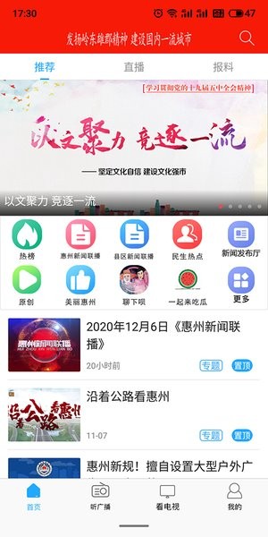 1、视听娱乐--为您带来清晰流畅的直播、点播收视收听体验,涵盖惠州广电所有音视频节目资源。