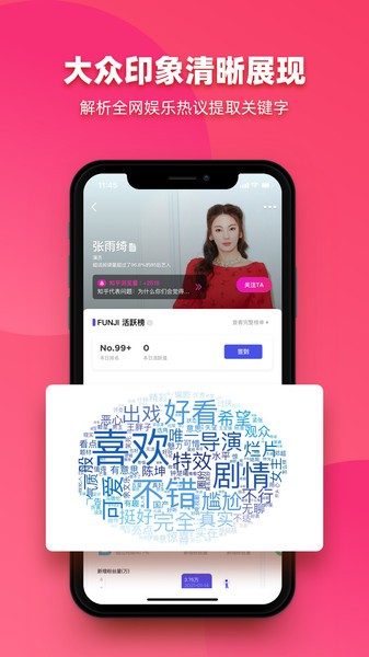 funji手机版是专注于娱乐圈艺人数据的应用软件,覆盖全面,实时监控,收录汇总了大量艺人数据,多维度进行分析和展示,直观明了,让大家可以轻松了解艺人相关的提及热度指数、粉丝活跃、最新排名等情况,反映艺人的业务能力水平,掌握娱乐行业变化趋势!