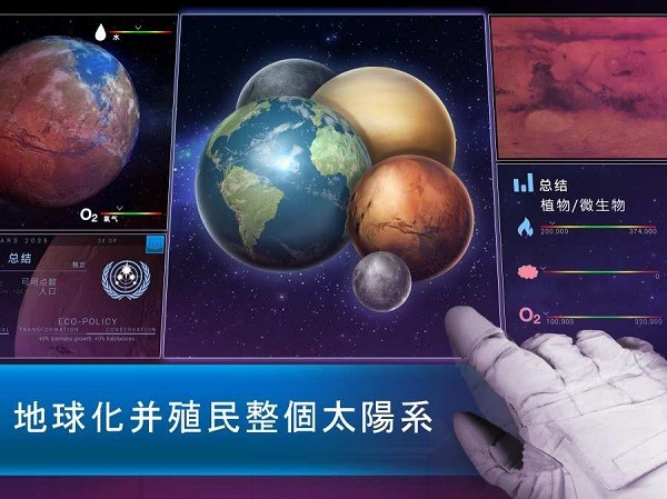 - 地球化您的星球,更改每个世界的特定属性,支持人类生活,这包括气压、氧气、海平面和生物质