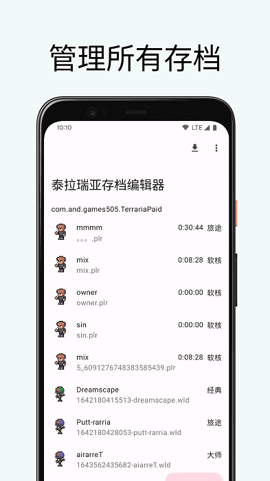 允许玩家编辑他们的 Terraria 移动版存档。你可以修改游戏中的各种元素,如物品、资源、金钱、生命值等,以自定义你的游戏体验。这使你能够快速获得所需的物品,解锁内容,或轻松调整游戏难度。