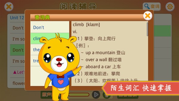轻松掌握陌生词汇,发音变速、AB复读,阅读配音让您随时随地练口语,帮助孩子快速提高英语成绩。