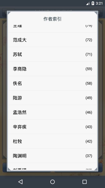 3、查看该分类的诗词列表,或点击按作者筛选标签并查看作者列表