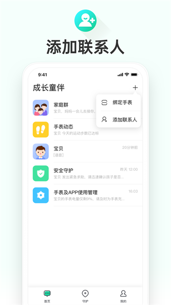 成长童伴软件是适合儿童使用的守护app,一键添加连接儿童智能手表设备,轻松关联共享,实时定位,安全守护,支持语音通话、视频聊天,实现亲子互动,还可以记录历史轨迹,提供安全区域、手表管理等功能,自定义设置,操作简单!