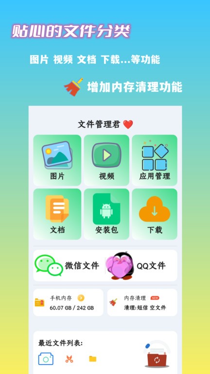 文件管理君最新版可以快捷整理文件的一个手机数据管理软件,你可以用它来编辑不同文档,支持解压、压缩等人性化操作,让文件储存更加便利,简洁的页面以及清晰明了的功能布局让用户使用起来更加轻松。