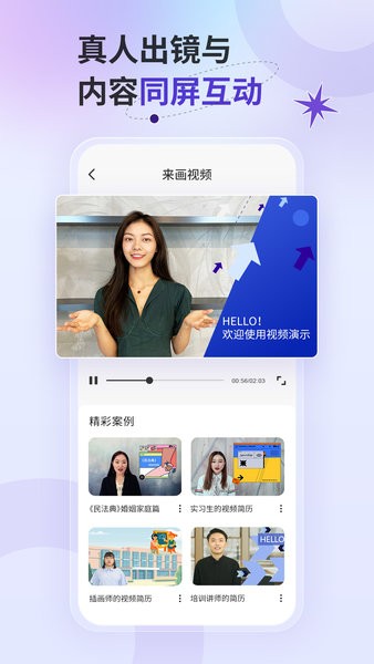 来画视频app官方版手机版(动画制作)是一款很有特色的演示视频录制制作工具,简单来说,就是在ppt文稿中加入真人视频解说或演讲。只播放ppt会略像单独;但是,如果加上真人同屏互动,进行配套的演示,那效果就很不一样了,形象生动。