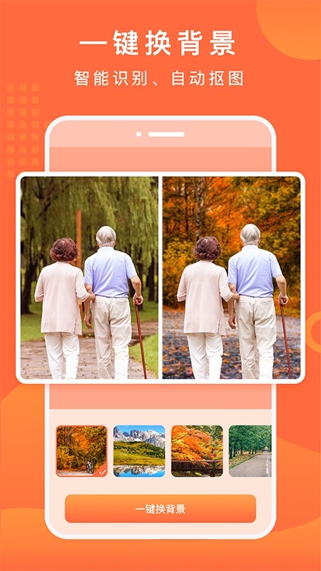 运用智能AI技术及自动抠图手段,达到发丝级抠图效果,更有多种背景模板,自定义背景轻松换。