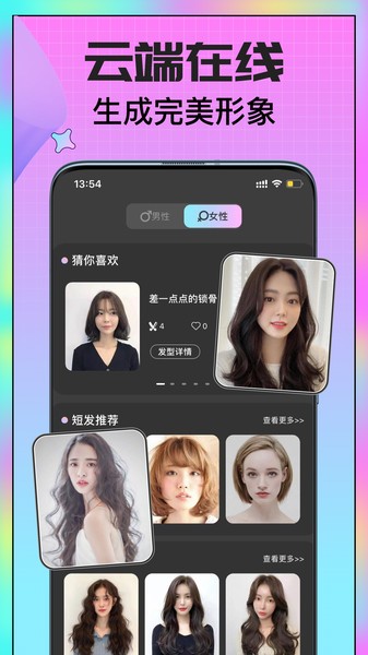 2、会根据大家的脸型来匹配到更适合的发型,还有全面的智能算法推荐给大家;