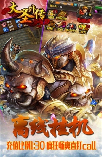 《大圣外传》是一款3D养成挂机游戏;现在下载,即送神将、神装和海量钻石,登陆可直升VIP8,各种福利无限制!话说孙悟空成功护送唐僧西天取经以后,化身为斗战胜佛和齐天大圣,斗战胜佛在西天修行佛法,而齐天大圣则回到了花果山继续逍遥自在。大圣外传就是齐天大圣回去后和异世界的邪神们之间的故事。。。东方仙佛与西方诸神之战一触即发!