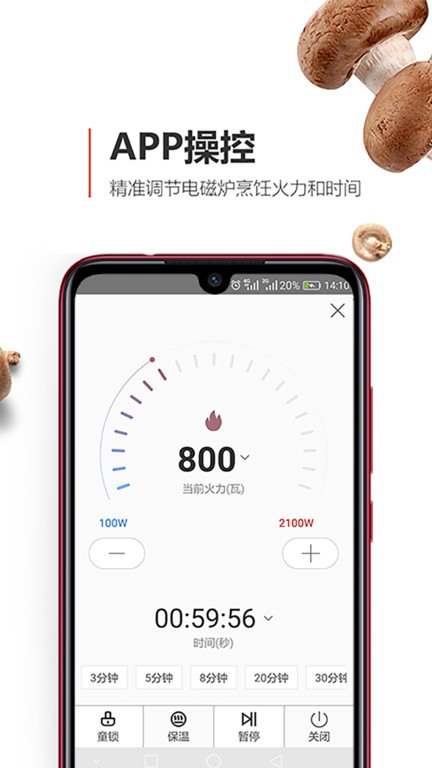 通过蓝牙连接手机与安利皇后智能烹饪电磁炉,可使用APP控制电磁炉的火力、时间,以及完成童锁、保温、暂停、关机的操作(电磁炉关机状态下不能通过APP开机);