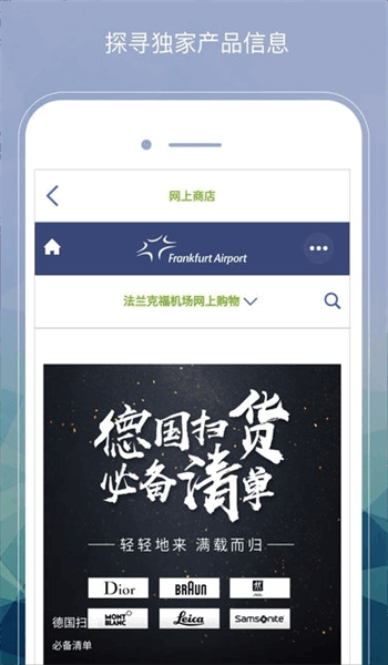 -- 访问法兰克福机场的网上商城,在琳琅满目的精选高端品牌、专属旅行产品中挑选喜爱的商品并享受最优折扣。使用 Click & Collect(轻松易购)即可预购心仪商品,并在旅行出发当日取货。搭乘欧盟境内航班的旅客可尊享送货上门/酒店服务。