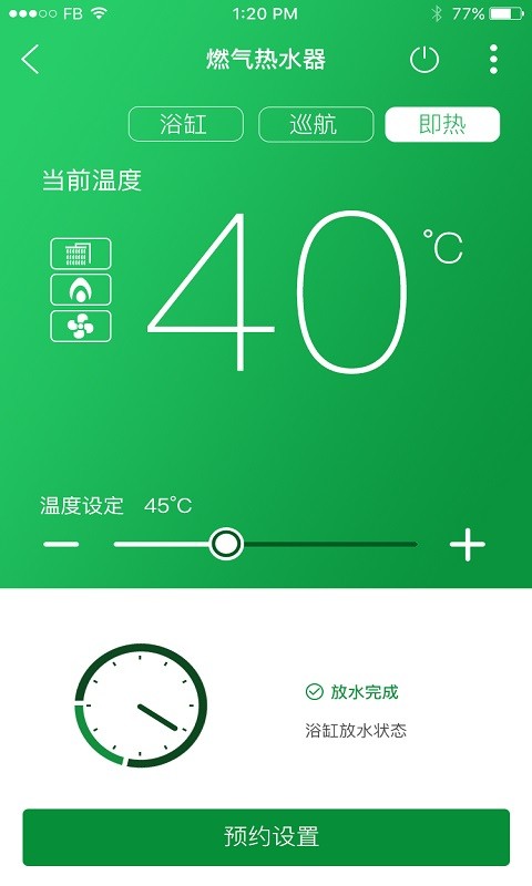 实时的热水器工作状态,首页直观展示当前的热水器实时工作状态信息;
