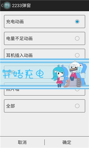 2233弹窗app是体积小巧,功能强大的手机动画弹窗工具,主要提供二次元bilibili形象显示,支持充电动画、电量不足动画、耳机插入动画等多种形式,随你自由选择,在线设置,轻松打造不一样的界面效果,让手机充电更具个性化,操作非常简单!