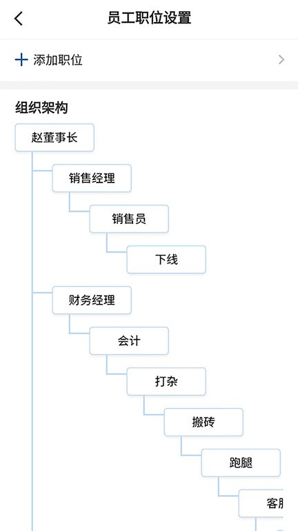 打开员工职位设置版块,在线设置公司的组织架构,一键添加新职位