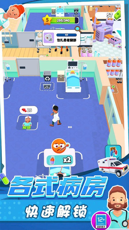 3、为更多的病人进行治疗,赚取获得丰厚的奖励,完成各种各样的任务,扩大医院规模