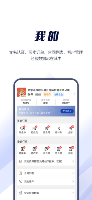 我的二维码名片、平台实名认证、我的订单、卖家资源管理、合同列表、客户管理、企业经营数据、平台用户数据、用户设置。可视化的数据为您企业经营提供技术支持。
