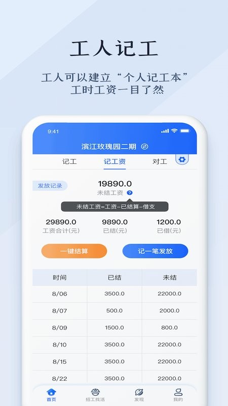 劳务记工,专为建筑工友打造的记工好帮手!为了让海量记工数据不再成为您的困扰,也为了让您避免因对账误差而陷入劳务纠纷当中,我们匠心打造了方便实用的记工工具。