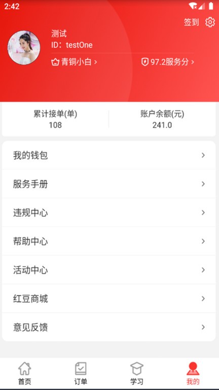 打开个人中心,查看自己的累计接单数量和账户余额信息,了解钱包明细