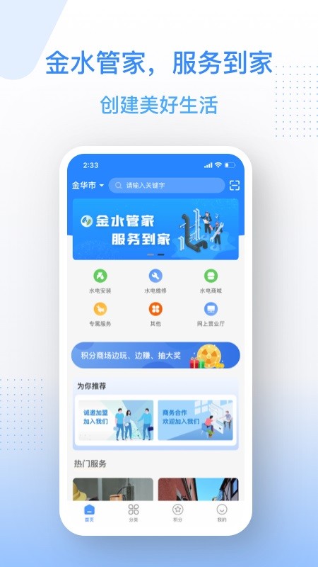 用户可通过金水管家App进行维修服务的发起,等待专业师傅联系上门维修,后续进行订单价格确认服务完成后支付、评价。获得服务积分后还可以享受抽奖、兑换等福利。