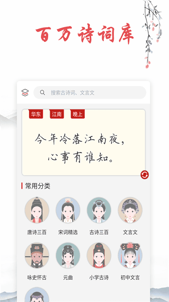 提供丰富古诗词之外,通过名句、古籍功能对经典句子、书籍进行学习,领略中华文学。