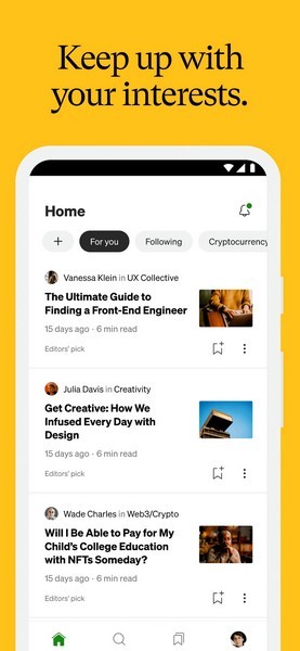 medium最新版是一款提供相关知识专业文章分享阅读学习的应用软件,涵盖丰富的资源内容,各种类型的主题文章可以浏览访问,精选推荐,关注感兴趣和喜欢的作家和出版物,还可以在线评论互动、分享创作,发表你自己的故事,在写作中赚钱!