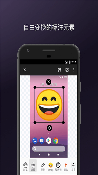 马克标注安卓版是提供图文标注服务的应用工具,有着十分小巧的体积,简洁的界面,提供各种各样的标注元素,丰富有趣,个性十足,支持箭头、图像以及表情符号标注操作,可以自由变换,在线编辑处理,轻松制作,支持图片导出!