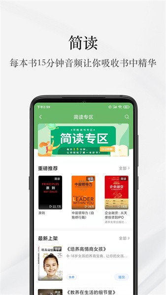 这款早晚读书app听起来挺不错的,是由当当网创始人李国庆创办的,主打用音视频形式传递知识,感觉挺方便的。里面有很多书院分类,比如自我成长、父母养育、亲子共读和通识教育,每个板块都有精选书籍推荐,像《人性的弱点》《罪与罚》这些经典书都被浓缩成45分钟的音频讲解,适合没时间读书的人快速吸收精华。