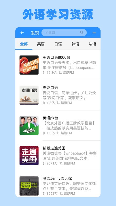 4、外语音频发现功能收集了上万个热门外语资源,让你收听外语学个够