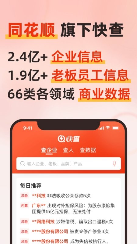 快查是同花顺旗下APP,一款专业的查企业信息的软件。专注于企业信息背景征信查询以及企业风险内幕挖掘,为各界人士提供丰富、客观的企业背景、风险、经营、资质许可等信息数据,更是各界商务人士使用的企业征信利器。