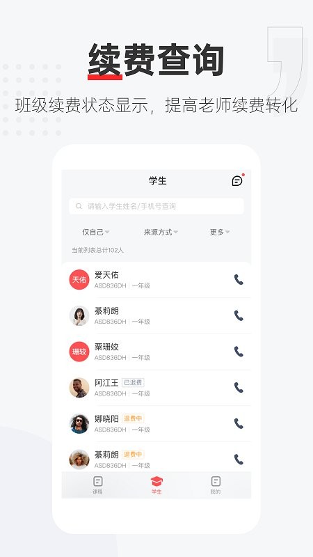 图文并茂精准显示学生上课情况、学生续费统计,并且支持查看讲次/班主任/学生的课程学情统计,方便老师了解每一个学生的学情。