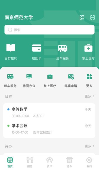 南京师范大学最新版是南京师范大学官方智慧掌上校园客户端,提供一站式便利的校园生活教务教学管理学习服务,包括校园新闻动态推送、校园卡、班车服务、掌上医疗、协同办公、邮箱申请、日程待办等,随你使用体验,操作简单,面向本校师生!