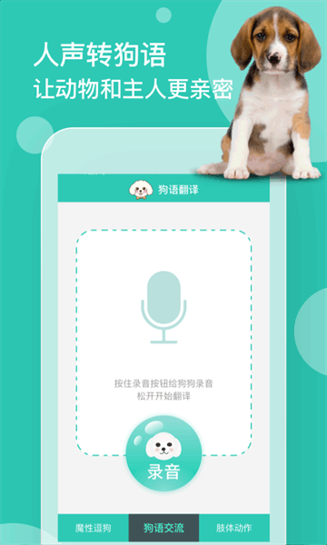 狗语翻译app是一款专门为家养宠物狗使用的动物翻译器app,为了让你听懂爱宠的叫声,该软件可以让您与狗狗很好的进行交流,欢迎你来下载。