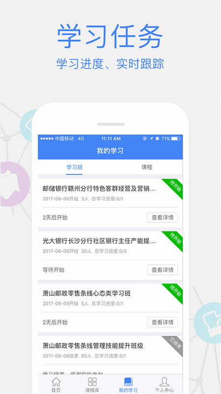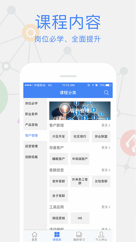 卓越微课是银行员工的营销支撑督导平台,汇聚百位大咖讲师,拥有海量精品课程,让银行人充分利用碎片化时间,让学习更高效。课程内容涵盖岗位必学、职业素养、产品营销、客户管理、经营管理以及创新拓展六大板块,服务银行多个岗位,实现银行人从基础到素质再到能力的全面发展提升。