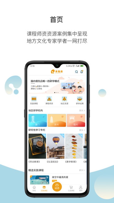 齐物志app最新版软件有非常丰富的研学课程资源,课程种类丰富,不仅有中小学生的课程,也有适合职场人士的课程,能够输入关键字查找想学的课程,在线购买学习超方便,还能查看历史的学习进度和记录,支持进行课堂评价。