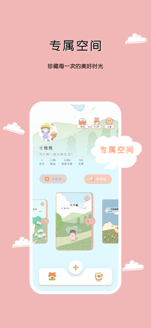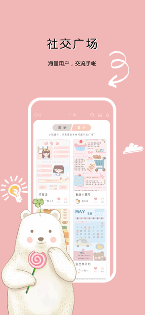 首页是小熊的可移动温馨小家,家具贴纸diy装扮,自定义素材,背景可自定义颜色,真正满足个性化服务。点击+号选择“随记”或者“手帐”开始你的手帐之旅。