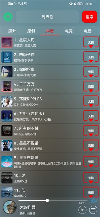 3.支持标准、极高、超品以及无损四个音质选择,而且支持收费音乐的免费下载,下载后的文件在文件管理的搜云音乐中;