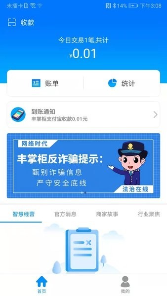 丰掌柜商家版是为商家打造的线上收款办公管理平台,帮助商家提高办公效率,实时统计账单,交易数据一目了然,智慧经营,还聚焦行业资讯动态,实时推送相关信息,可以在线了解,设备管理更加方便,操作简单,是商家经营的一大帮手!
