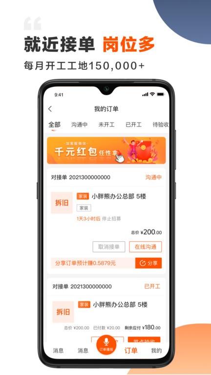 3、装修师傅在线接单,不需要在外面去一个个问,节省了精力,增加了收入。