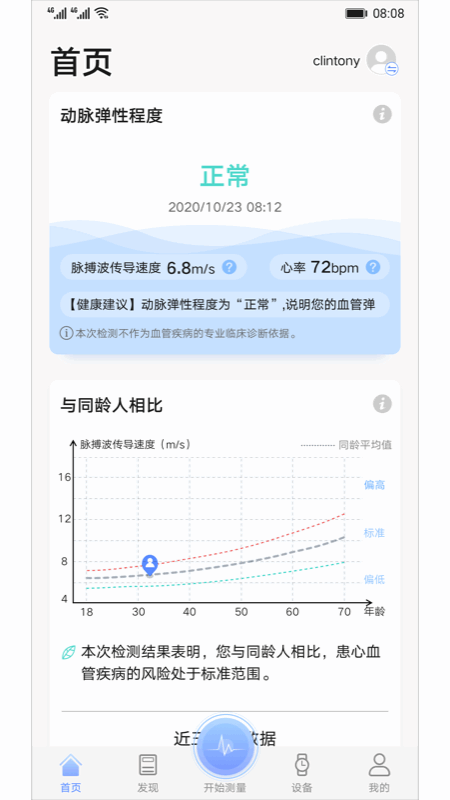 5、测量结束,即可在血管健康研究App上查看测量结果。