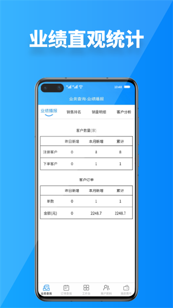4、清晰直观的业绩播报数据,业绩播报栏目下展示客户数量和订单两种数据播报表格;