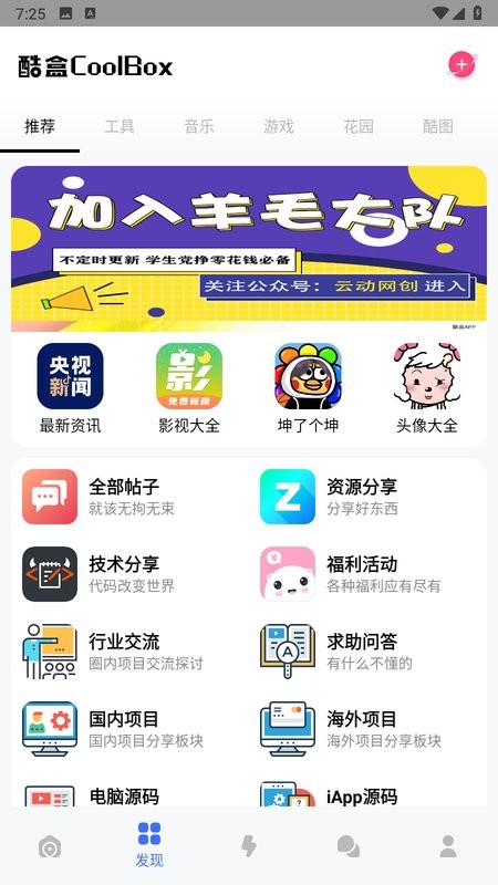 云动酷盒手机版作为免费的工具箱app,涵盖丰富全面的资源,提供资源分享、技术分享、行业交流、求助问答、福利活动等享受,还拥有各种工具、音乐、游戏。酷图等资源应用,根据需要自由选择,下载使用,适用于不同场景,满足个性化需求!