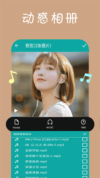 动感相册影集是一款集视频剪辑视频创作视频美化工具与一体的视频编辑软件,专注于小视频短视频的拍摄编辑功能,视频截取,比例调整,视频反转 视频镜像,快放慢放处理,去背景音,视频拼接,视频分割旋转等功能,支持可以从视频中单帧图片提取,制作动感音乐相册等功能,还支持各种视频小工具,视频转换格式,,视频压缩,视频转音频处理,以及视频转gif等功能,满足您日常的视频创作,方便快捷。